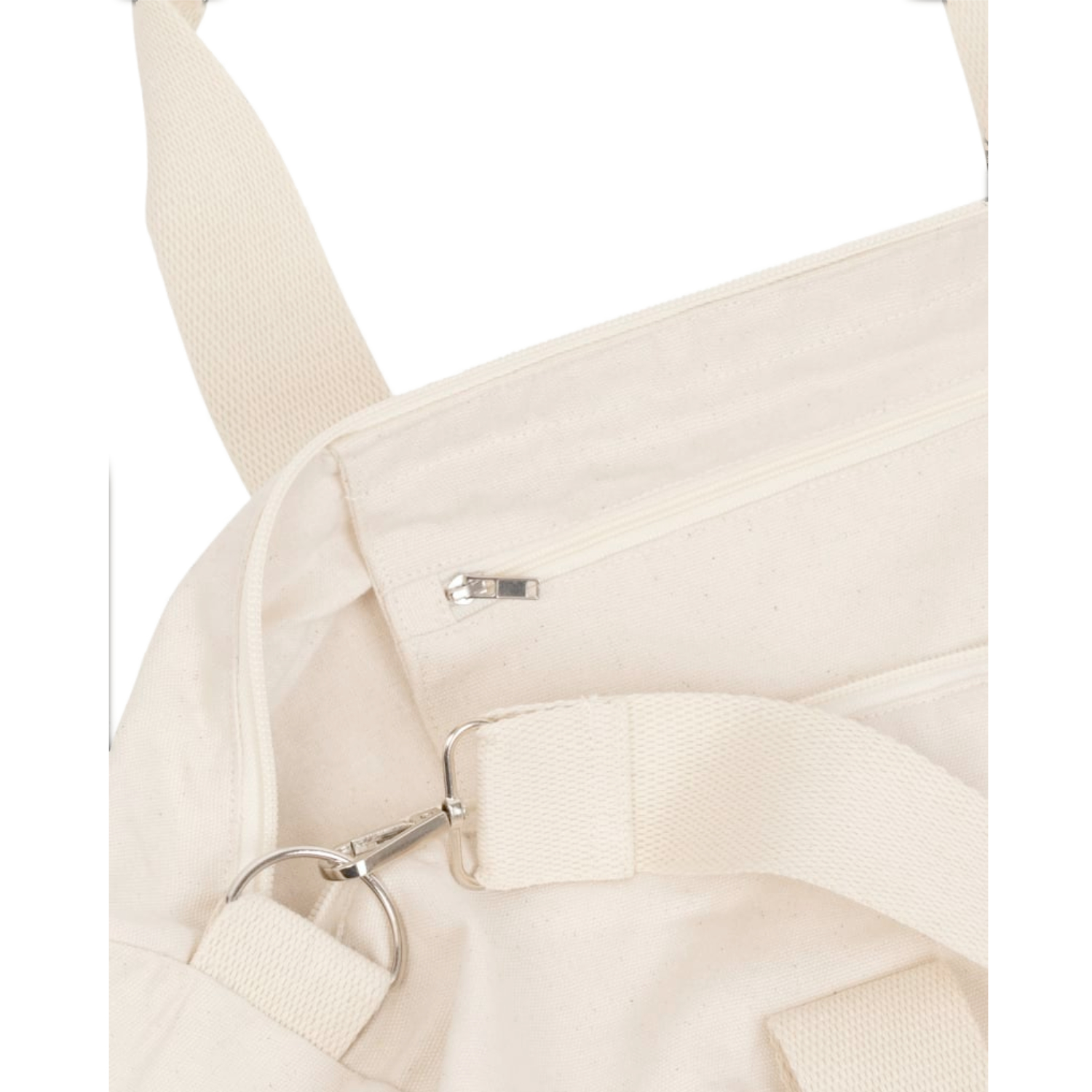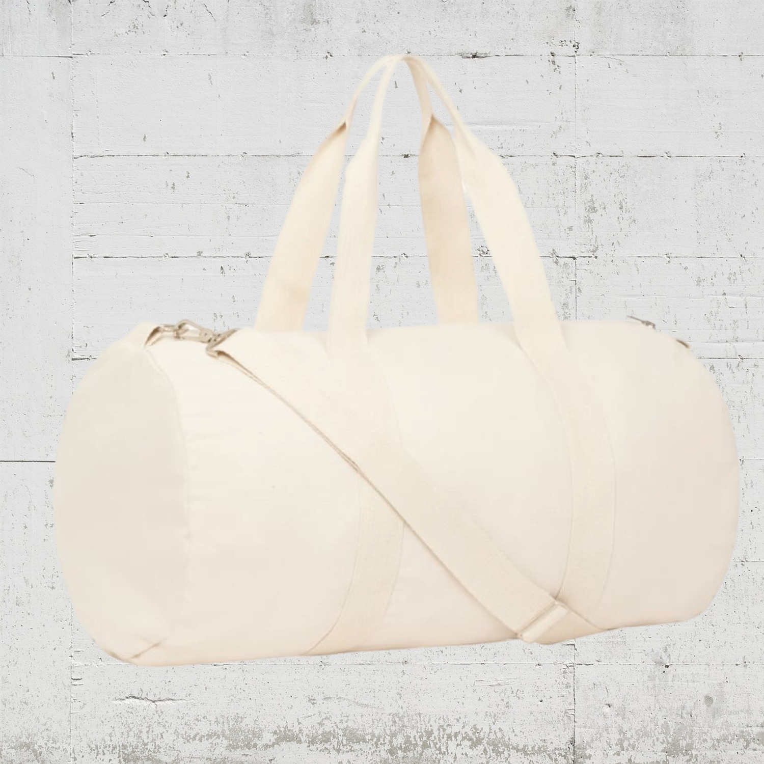 Die Duffle Bag besteht aus 80% recycelter Baumwolle und 20% recyceltem Polyester.