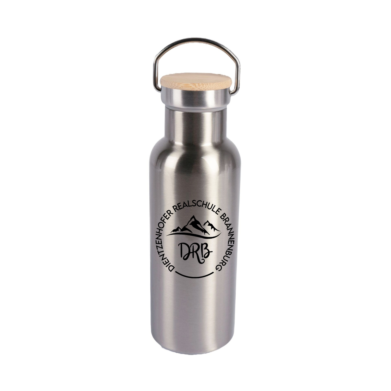 Diese doppelwandige Edelstahl-Thermoskanne ist in silber oder weiss erhältlich und mit dem schönen DRB Berge-Logo der Dientzenhofer Realschule Brannenburg bedruckt. Sie hat einen schönen Bambus-Deckel mit einer großen Öffnung, in der Du ganz easy Deine Heissgetränke, Deine Säfte oder auch Deinen Smoothie einfüllen kannst, ohne alles zu verkleckern. Du kannst je nach Einsatzzweck zwischen drei verschiedenen Größen wählen, 400ml, 500ml oder 750ml.